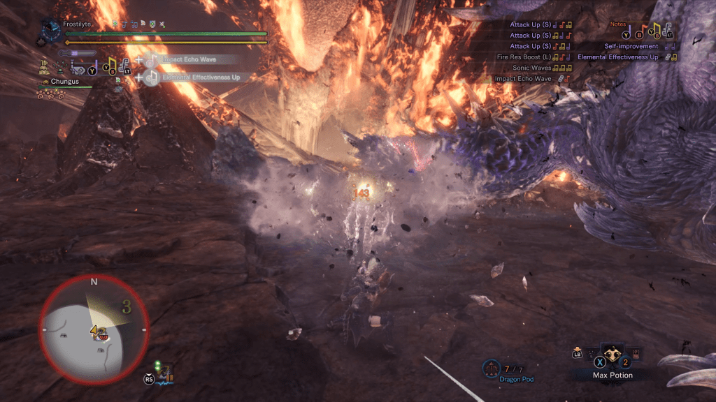 Secondly, came supplies. You don’t have the ability to return to base during this fight so bringing crafting supplies to make additional healing items mid-fight is essential. With only two max potions and ten mega potions I’d be tapped out pretty quickly, but with seven max potions and twenty mega potions I was in much better shape to sustain through the whole fight. It’s also worth noting that this had the knock on effect of making every other fight in the game a lot easier because my supplies stopped running out in some of the harder fights.