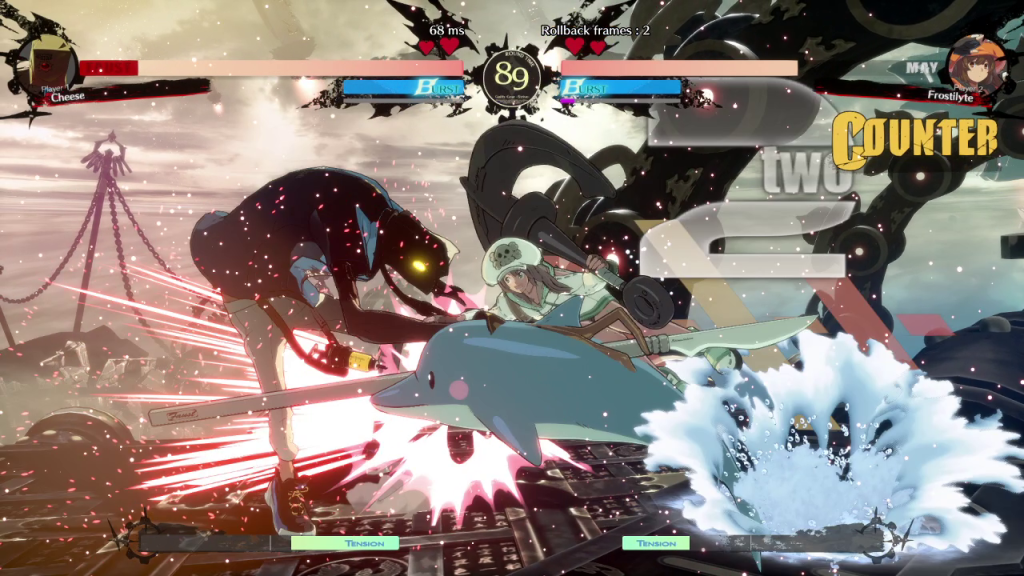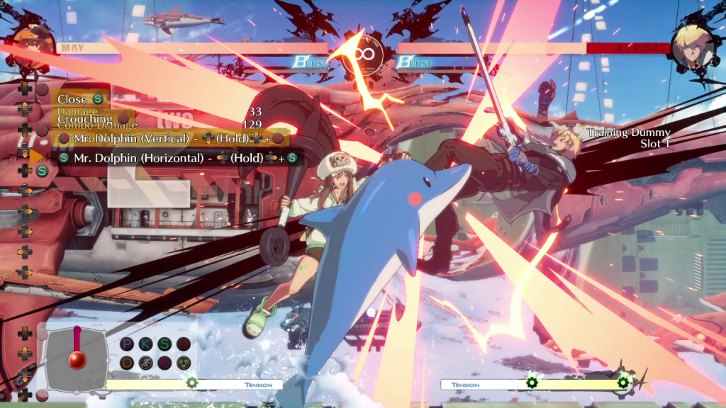 While looking into this I also learned that in-game slowdown caused by scoring a counter-hit doesn’t affect charging time. This opens up additional opportunities for using Mr. Dolphin as players only need to hold their charge for the real-world time rather than the slowed down game time. Counter-hits don’t provide a window so large that I can start partway through the slowdown and still hit the moves, but if I’m late on starting the charge on my previous attack this slowdown effect can help to provide the necessary buffer required to ram into my opponent.