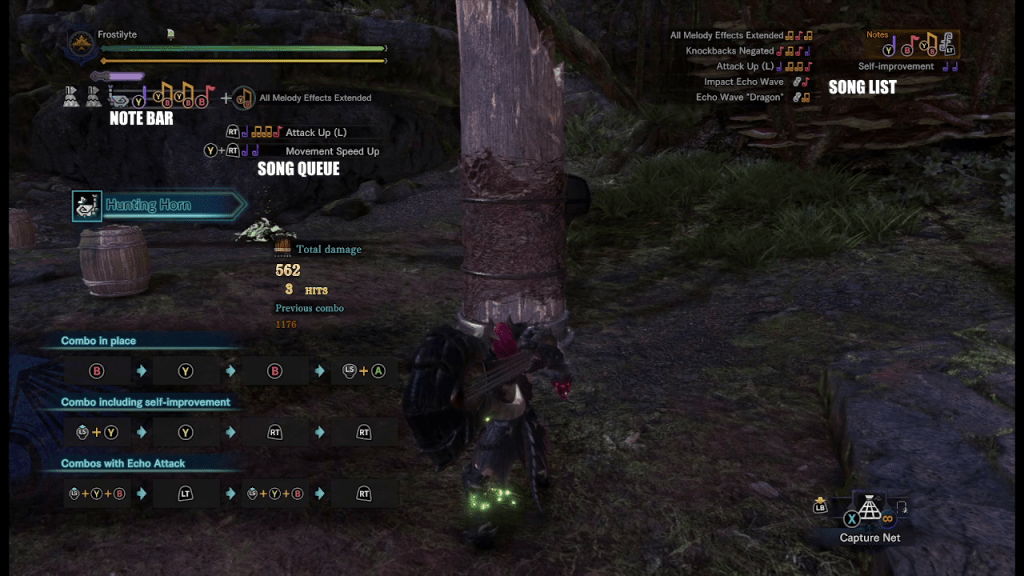 Before covering the changes, it’s important to establish how the Hunting Horn used to work. It was the closest thing Monster Hunter had to a support weapon, with a primary gimmick of playing songs to cast buffs on yourself, and your teammates. Each of the weapon’s attacks (each button press) corresponds to a note, and as you swing the weapon, said notes appear in a bar on the left hand side of the screen. Playing these notes in a set sequence would queue up a song, and using your powerful performance attack would activate the buffs associated with all queued songs. In essence, you had a weapon where optimal combos involved keeping buffs active, rather than doing the highest possible damage, and I thought that was really fun.