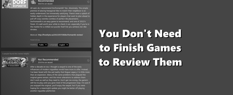 I agree finishing a game isn’t necessary to review a game — but where we differ is, that I think that holds true regardless of whether your recommendation is a positive or a negative one.