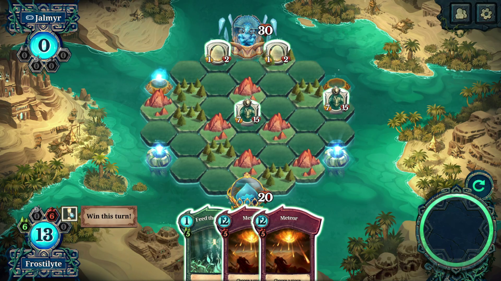 The second new mission type was puzzles. These always present the player with a situation where they need to figure out how to win in a single turn. There is only one solution to each, so your goal is to figure out the correct sequence of cards to play, and moves to make. What’s great about this mission type is that it helps to introduce many of Faeria’s core mechanics, and demonstrates the variety of ways they can be used. One of my favourite early examples of this, was using a spell card to kill one of my own minions, so I could reap the benefit of its ability that triggered when it died.