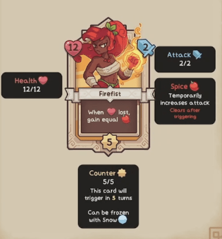 Given the sheer power of Snow, I recommend carrying at least 2 cards that can apply Snow in a run. All of the starting decks contain at least 1 Snow card, but having 2 or more provides a lot of extra utility. Specifically, Snow will let you lock down certain enemies so you can eliminate them before they attack, or space out enemy attacks across multiple turns. Either way, Snow gives the player a ton of control over the enemy’s attacking cadence, so having a few cards that can apply this effect in your deck is imperative to scoring a win.