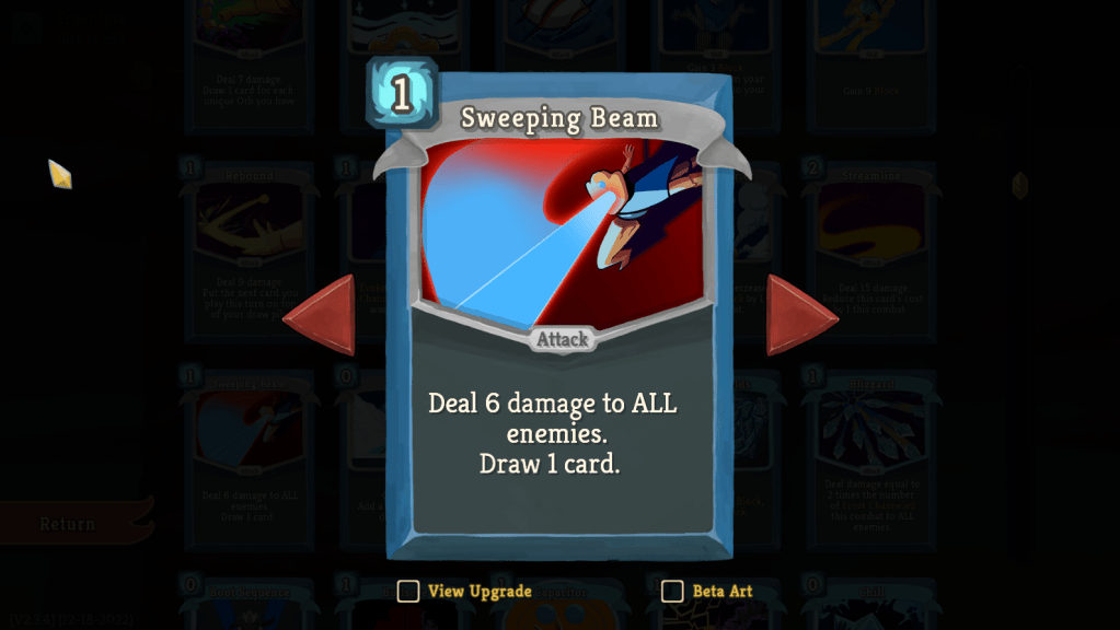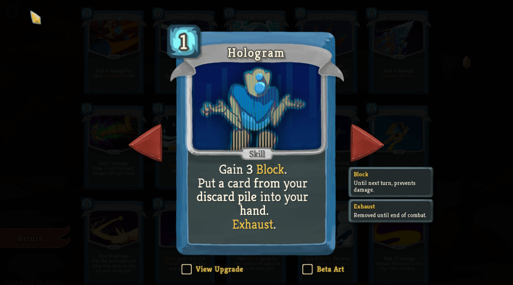 It isn’t just Claw that is a common card though: many of the cards that synergize with Claw are also common cards. Rebound, Sweeping Beam, and Hologram all create scenarios where the player can reliably play the same Claw card multiple times in a single turn. For example: you can play Rebound, which puts the next card you play at the top of your draw pile, then play Claw. Follow this with Sweeping Beam which draws 1 card, so you draw the Claw you just placed on top of your draw pile. After playing Claw a second time, it’ll be in your discard pile, but that just lets you play Hologram to pull Claw back into your hand. That’s 3 Claw uses in a single turn culminating in 24 damage from just Claw, and it’s all thanks to cards that will always be given as draft options because they’re common.